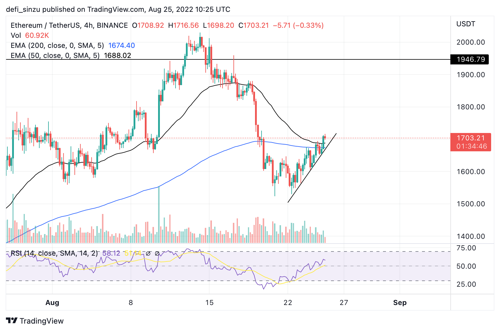 The price of ETH has continued to show a bullish trend holding above the 50 and 200 EMA prices, which correspond to $1,690 and $1,670, acting as support respectively to the ETH price.
