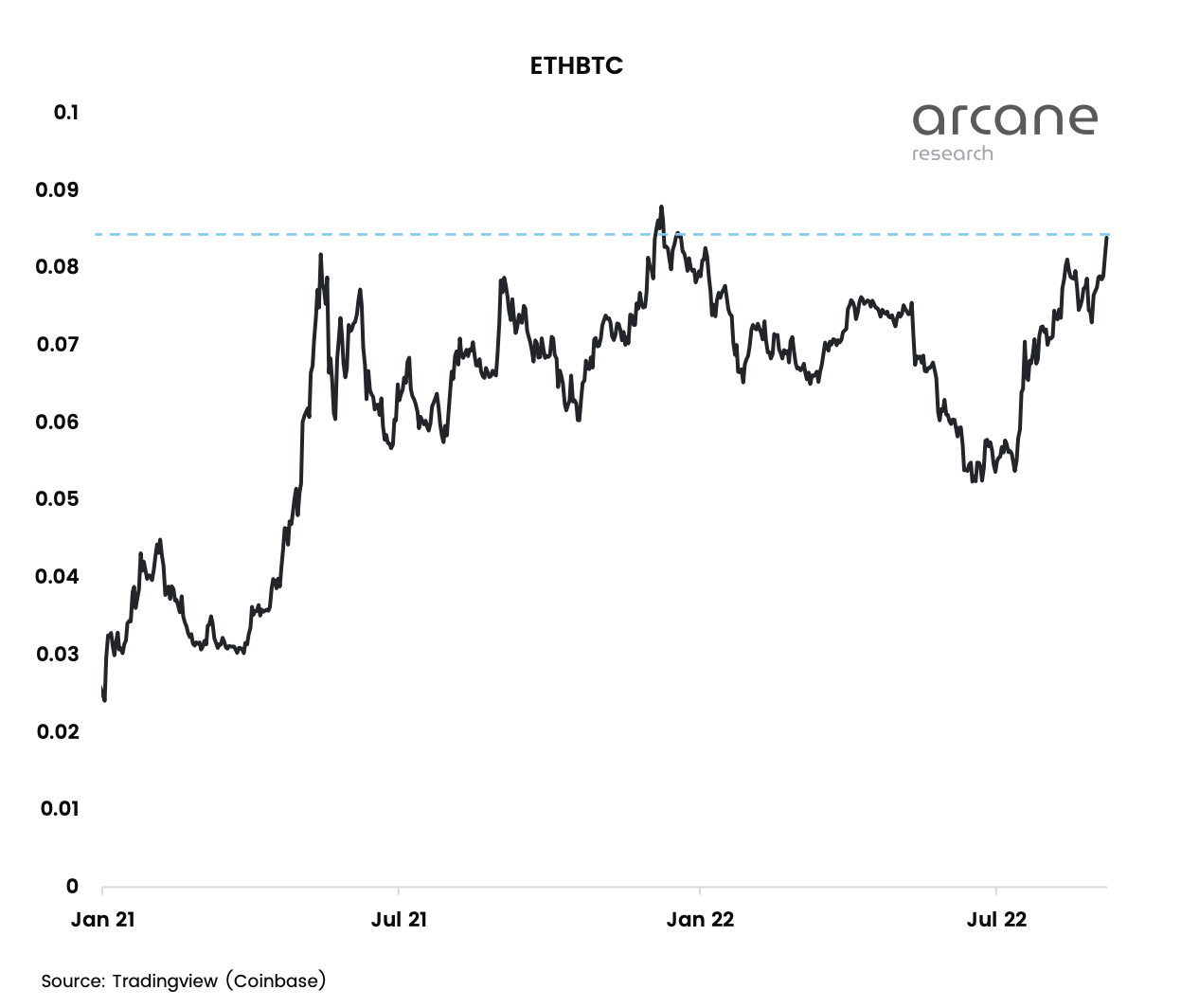 ETHBTC had traded at its highest level towards the end of 2021 before a decline sent it falling to yearly lows. However, with the Merge on the horizon, Ethereum has managed to close the gap significantly once more and rally to yearly highs.