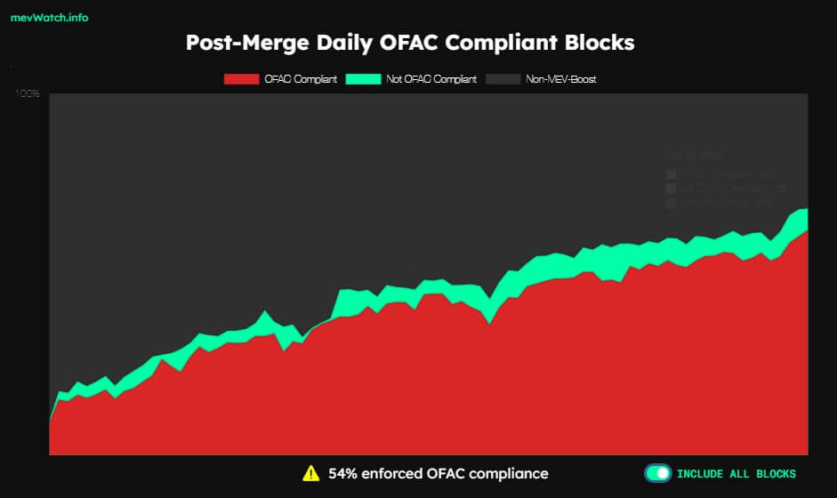 However, over the past month, there has been an increase in OFAC-compliant blocks produced on Ethereum due to using MEV relays such as Flashbots.