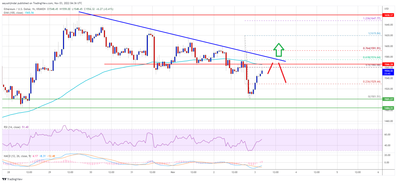 Ethereum failed to gain pace for a move above the $1,600 resistance zone. ETH corrected lower and traded below the $1,550 support zone after the fed increased rates by 75bps.