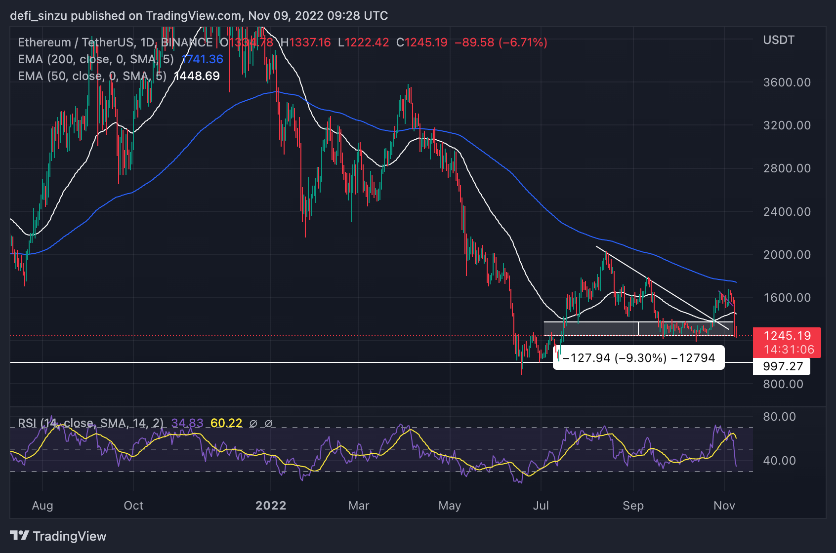 Previous weeks saw the price of Ethereum (ETH) and most altcoins trend higher as many produced gains of over 200%, including the price of Ethereum (ETH) rallying from a region of $1,300 to a high of $1,600 with many hoping the price of ETH would pull off a good price action to a region of $2,000. Still, these expectations were cut short by the uncertainty surrounding the crypto market. ETH’s price is looking weak with the current market issue between Binance and FTX, creating a fear of uncertainty and doubt for most traders and investors. (Data from Binance)