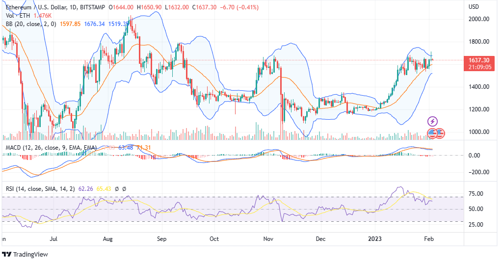 On the weekly chart, candlesticks are forming in the upper Bollinger Bands, but Ethereum formed a higher high that suggests a bullishness after four green candles. However, the interesting thing is that the last two weekly candles are indecisive Doji, which also suggests selling pressure.