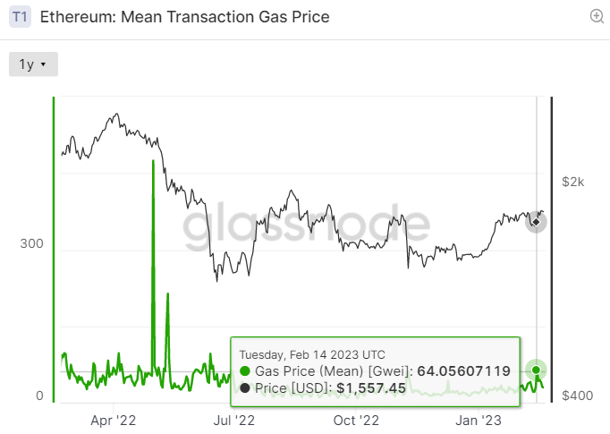 According to Glassnode, the gas price on the Ethereum network hit a seven-month high of 64 Gwei. 1 Gwei is equal to 0.000000001 ETH. The minimum gas fee (denominated in Gwei) that a user needs to pay for a transaction is calculated by multiplying the Gwei Gas Price by the Gas Limit, which is currently 21,000.