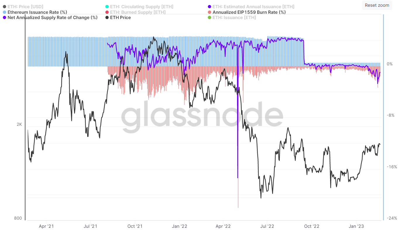At the time, the Ethereum blockchain was still powered by the much more energy-intensive proof-of-work consensus mechanism and, as a result of the much higher energy fees and miner rig costs incurred by the miners that powered the network, Ethereum’s issuance rate was much higher at around 4.4-4.6% per year. That means that Ether’s deflation rate only hit a maximum of around 1.5%.