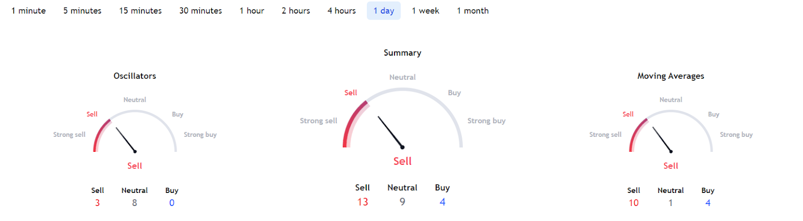 Meanwhile, the sentiment on the 1-day gauges retrieved from the finance and crypto tracking website TradingView is generally bearish for Ethereum, suggesting ‘sell’ at 13, as summarized from the oscillators pointing toward ‘sell’ at 3 and moving averages also in the ‘sell’ zone at 10.
