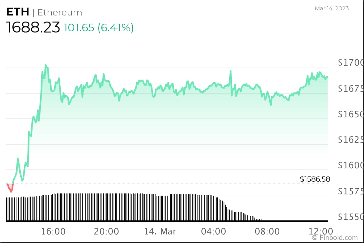 Ethereum is now testing resistance at $1,700, trading at $1,688; it is up 6.41% in the last 24 hours.