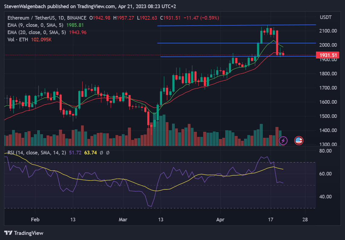At press time, CoinMarketCap shows that the altcoin leader’s price has dropped 1.57% over the last 24 hours. ETH’s weekly performance has also been dragged further into the red by the weak 24-hour performance. As a result, ETH’s weekly price performance currently stands at -8.72%. Meanwhile, ETH’s price stands at $1,932.51 at press time.