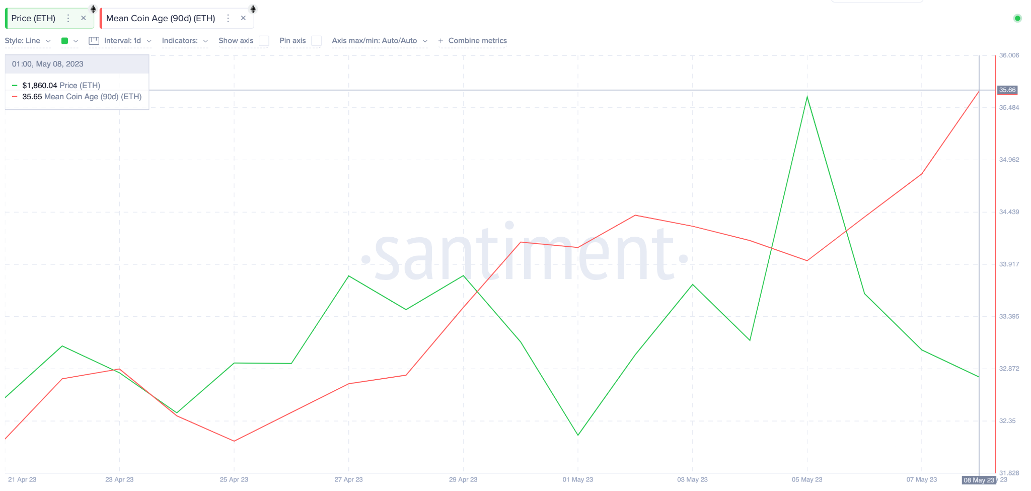 Looking at the chart below, while the price dropped 7%, ETH Mean Coin Age has increased from 33.95 to 35.65 between Friday, May 5, and May 8.