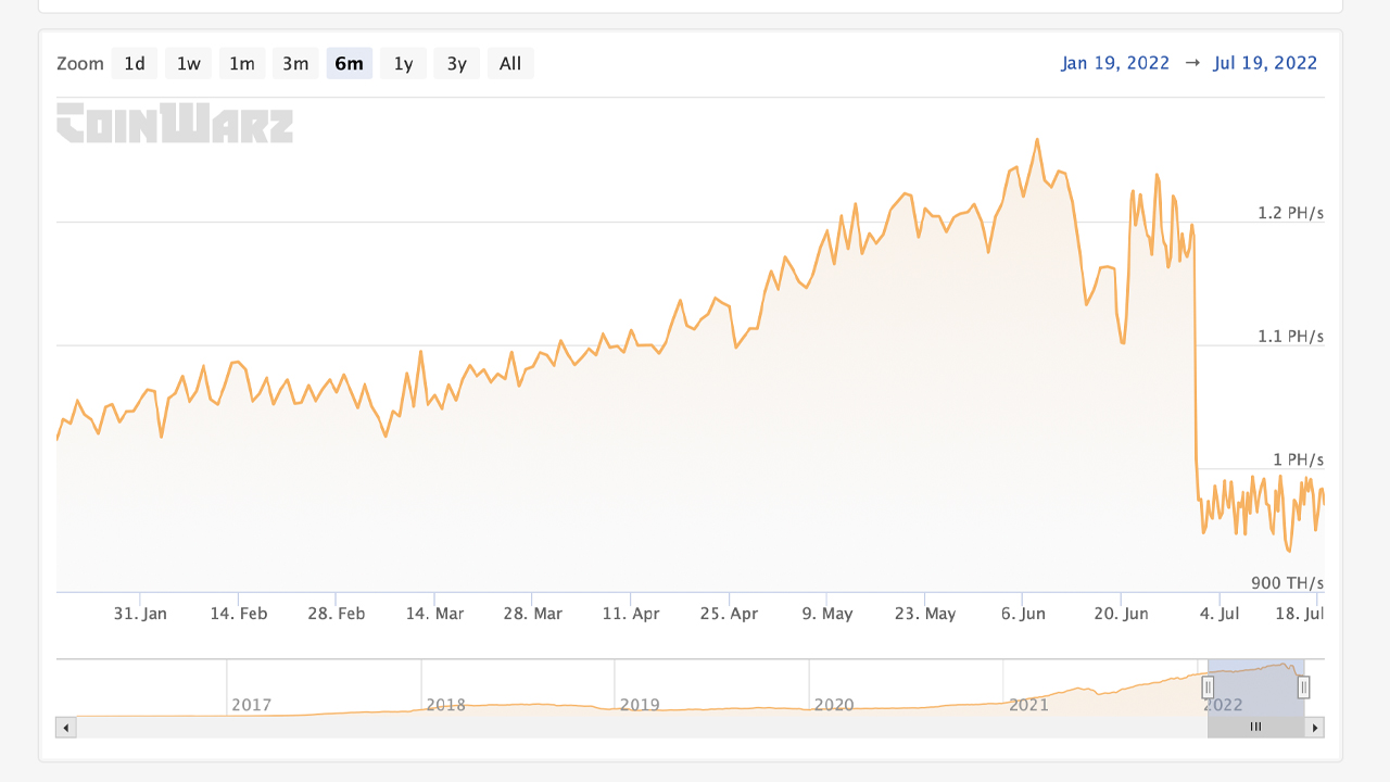 Interestingly, ETH’s hashrate has been dropping too, just as The Merge’s ostensible date was pencilled in by ETH developers last week. Overall, Ethereum’s computational power started to slide 44 days ago, after it reached an all-time high (ATH) at 1,320 TH/s or 1.32 petahash per second (PH/s) on June 4, at block height 14,902,285.