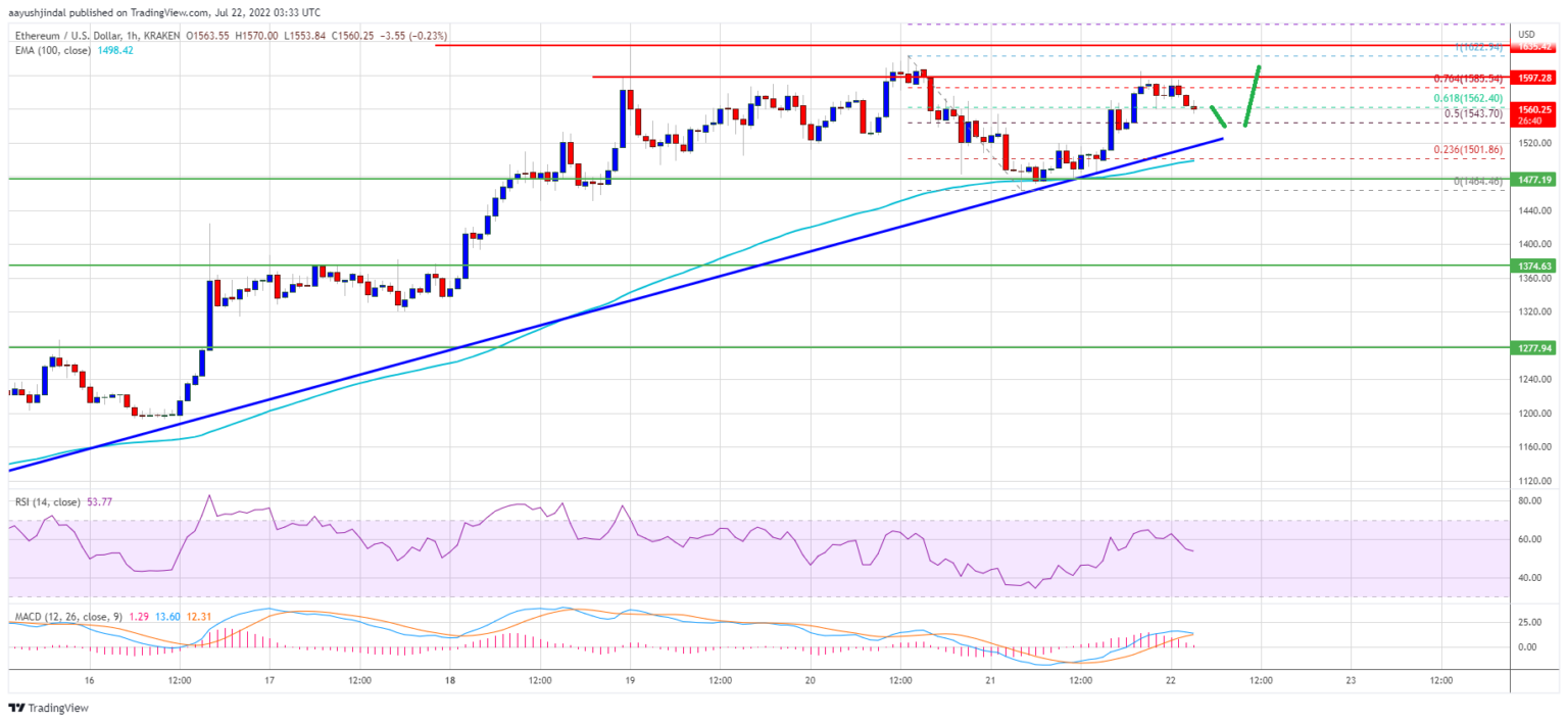 - The pair could start a fresh surge if there is a clear move above the $1,600 zone.