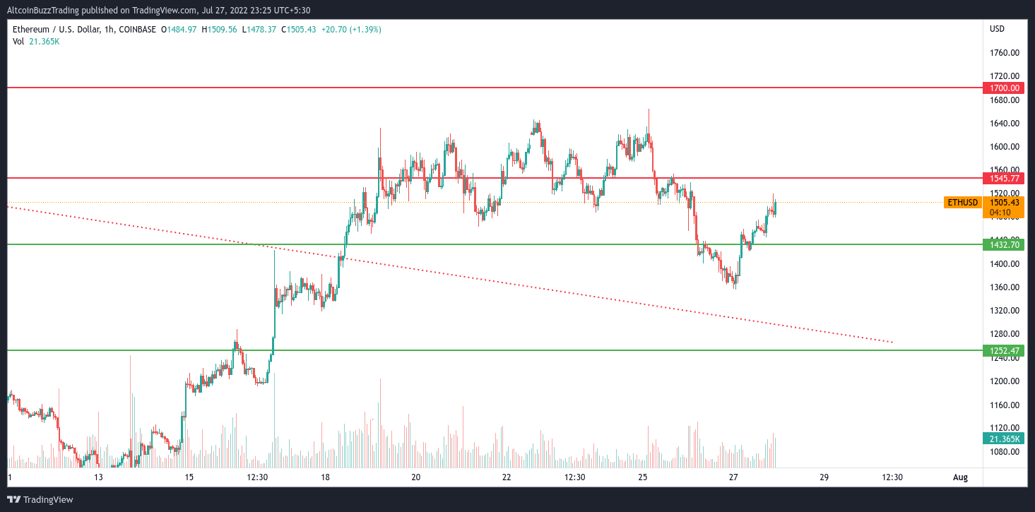 To the contrary, a significant decline came into play by the price’s meeting with the resistance zone between $1,600 and $1,650. The bulls must sustain the price of ETH above the $1545.77 support level to target $2,000 price level. Otherwise, the price would fall to the $1432.70 support level.
