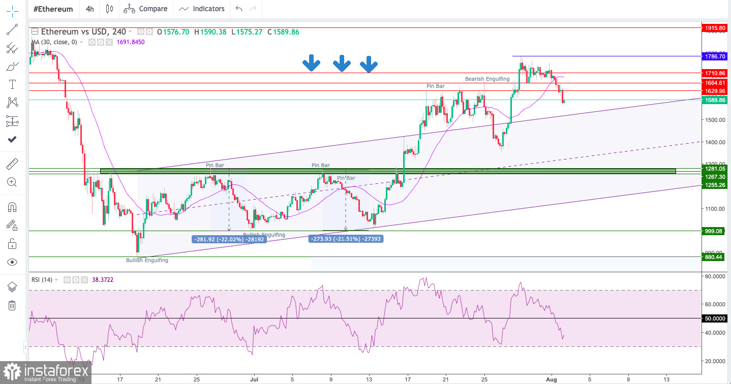 The ETH/USD pair had made a new local high at the level of $1,783 and then after a short period of distribution, reversed sharply towards the upper channel line again. The market came off the extremely overbought conditions on the H4 time frame chart and now the momentum is weak and negative. Nevertheless, the outlook remains bullish and higher prices should be expected. The next target for bulls is seen at the level of $1,915 and $1,954. The key short-term technical support is seen between the levels of $1,255 - $1,281.