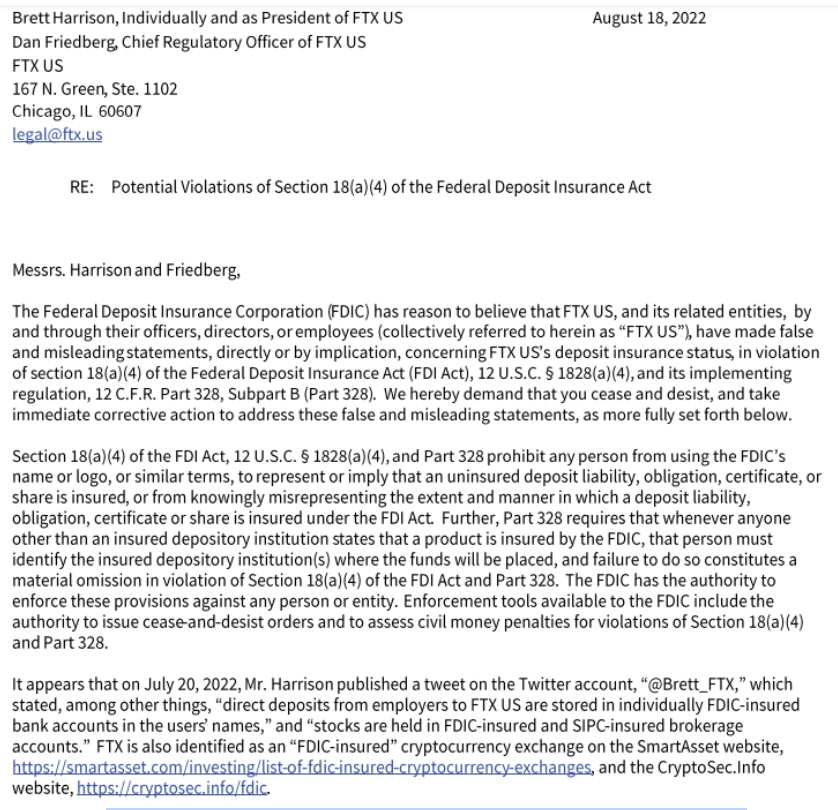 The agency sent a letter to FTX Exchange this month — along with four other entities — that included a cease and desist order for “false and misleading statements.” Namely, it accused the exchange of falsely implying that user funds were FDIC-insured.