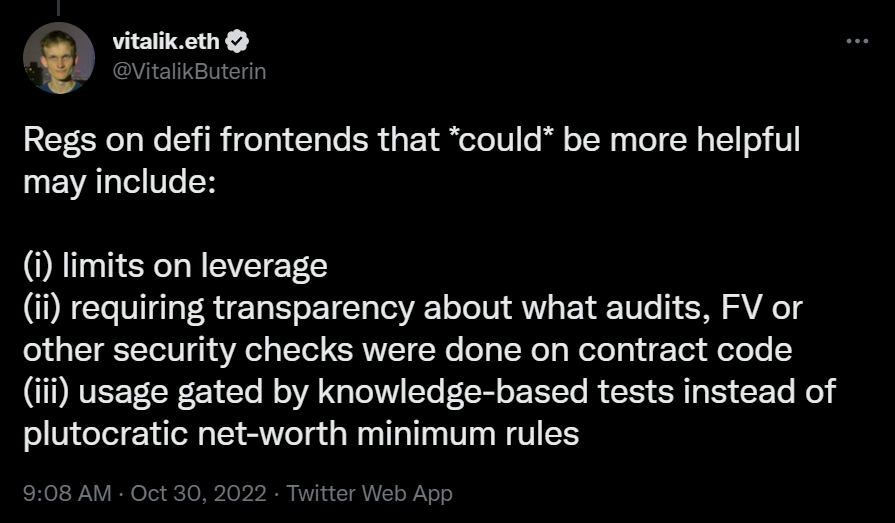 On an end note, Buterin recommended using zero-knowledge proofs to meet regulatory requirements while preserving users' privacy, stating that “I would love to see rules written in such a way that requirements can be satisfied by zero knowledge proofs as much as possible.”