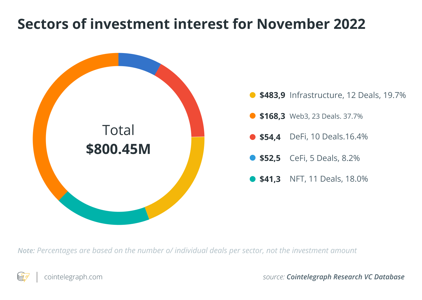 While the Web3 sector saw the most deals closed in November at 23, the blockchain infrastructure sector commanded the largest share of investors’ dollars. The sector attracted over half the funding in November, securing $483.9 million in venture capital.