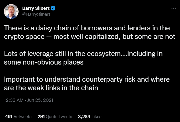 In his letter, Cameron noted that Silbert extracted liquidity from Genesis “to fuel greedy share buybacks, illiquid venture investments, and kamikaze Grayscale NAV trades.” In the meantime, social media has been abuzz with Silbert’s “prophetic” tweet regarding a “daisy chain” of liabilities.