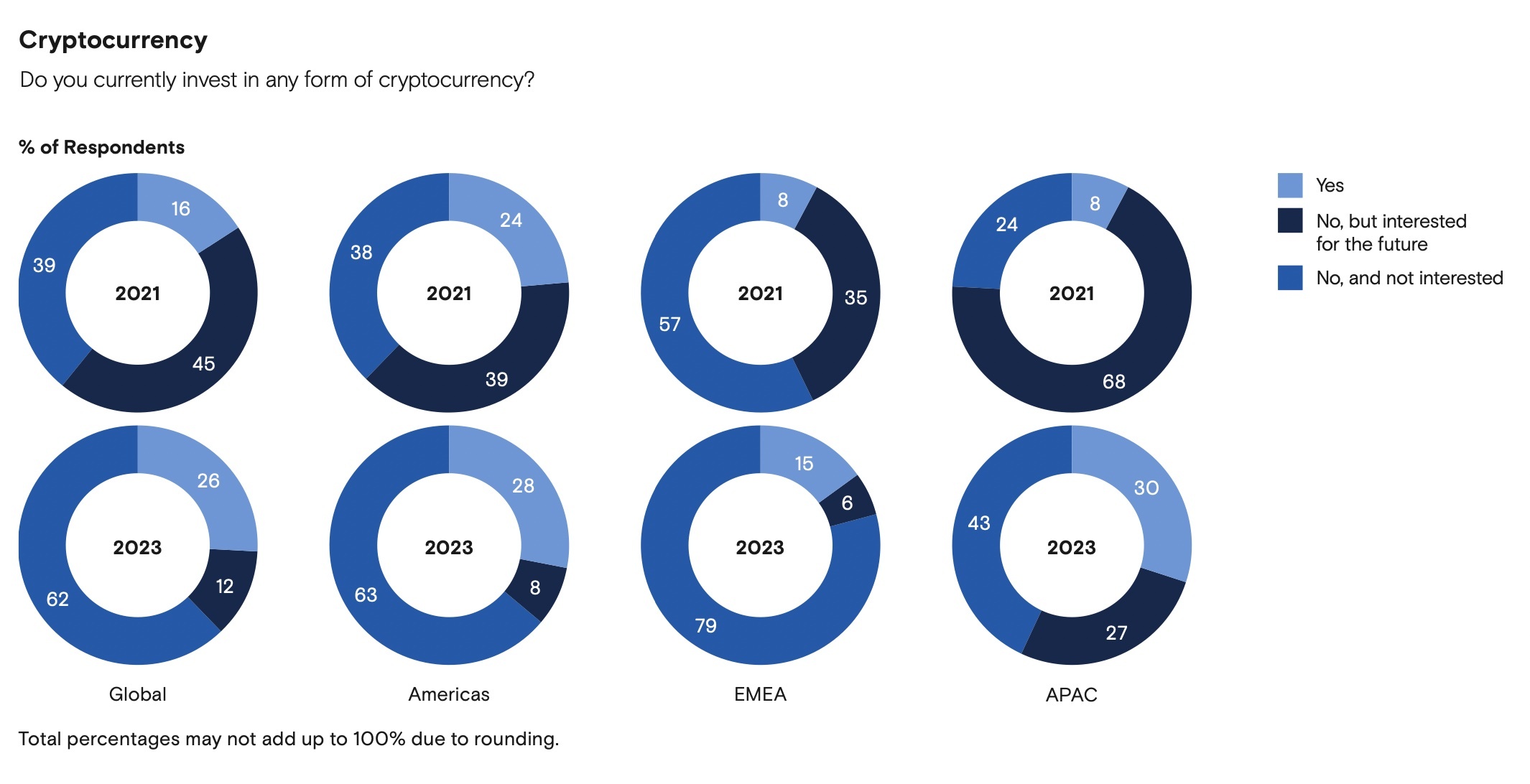 The proportion of family offices in the Asia Pacific region (APAC) invested in crypto — which was 30% — was slightly higher than similar firms in the Americas, or Europe, the Middle East and Africa (EMEA). Those APAC wealth managers also appear most interested going forward, with 27% reporting as such.
