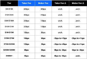 On Tuesday, September 20, 2022 at approximately 5pm ET, Coinbase Exchange will implement a new fee structure to account for changes in global crypto trading volumes and asset prices, lowering the monthly trading volume required to qualify for the mid and upper tiers of our fee schedule. The new fee schedule will be implemented on Coinbase Exchange, Pro, and Advanced Trade.