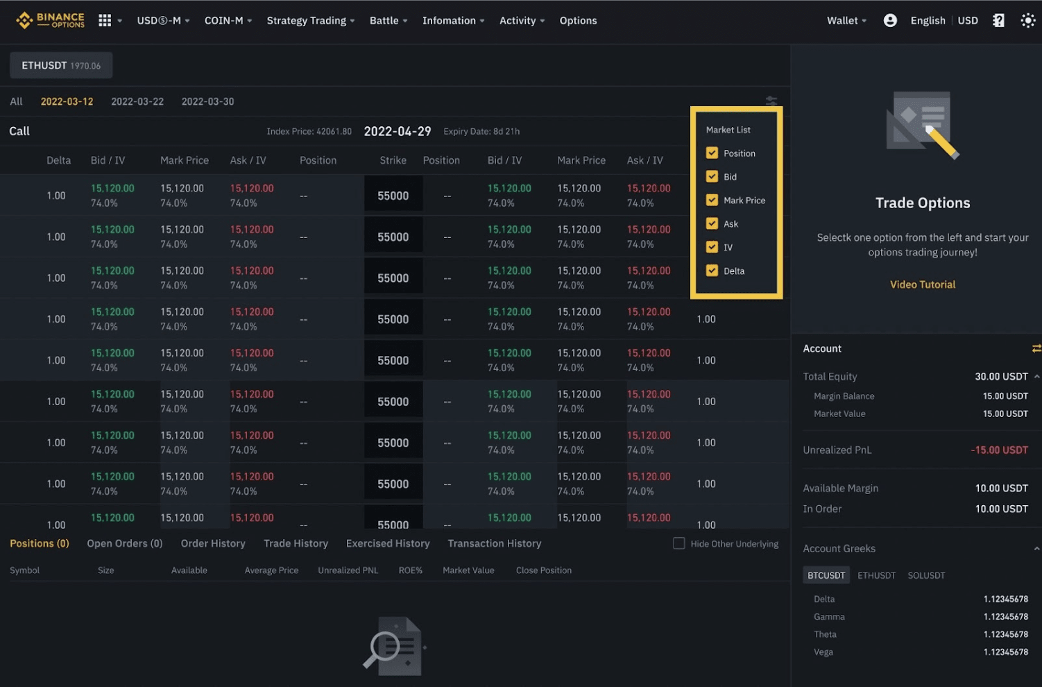 - ETHUSDT Daily Options will have a trading lifetime of two days and expire at 08:00 (UTC). There will be a maximum of two Daily Options contracts listed at any time.