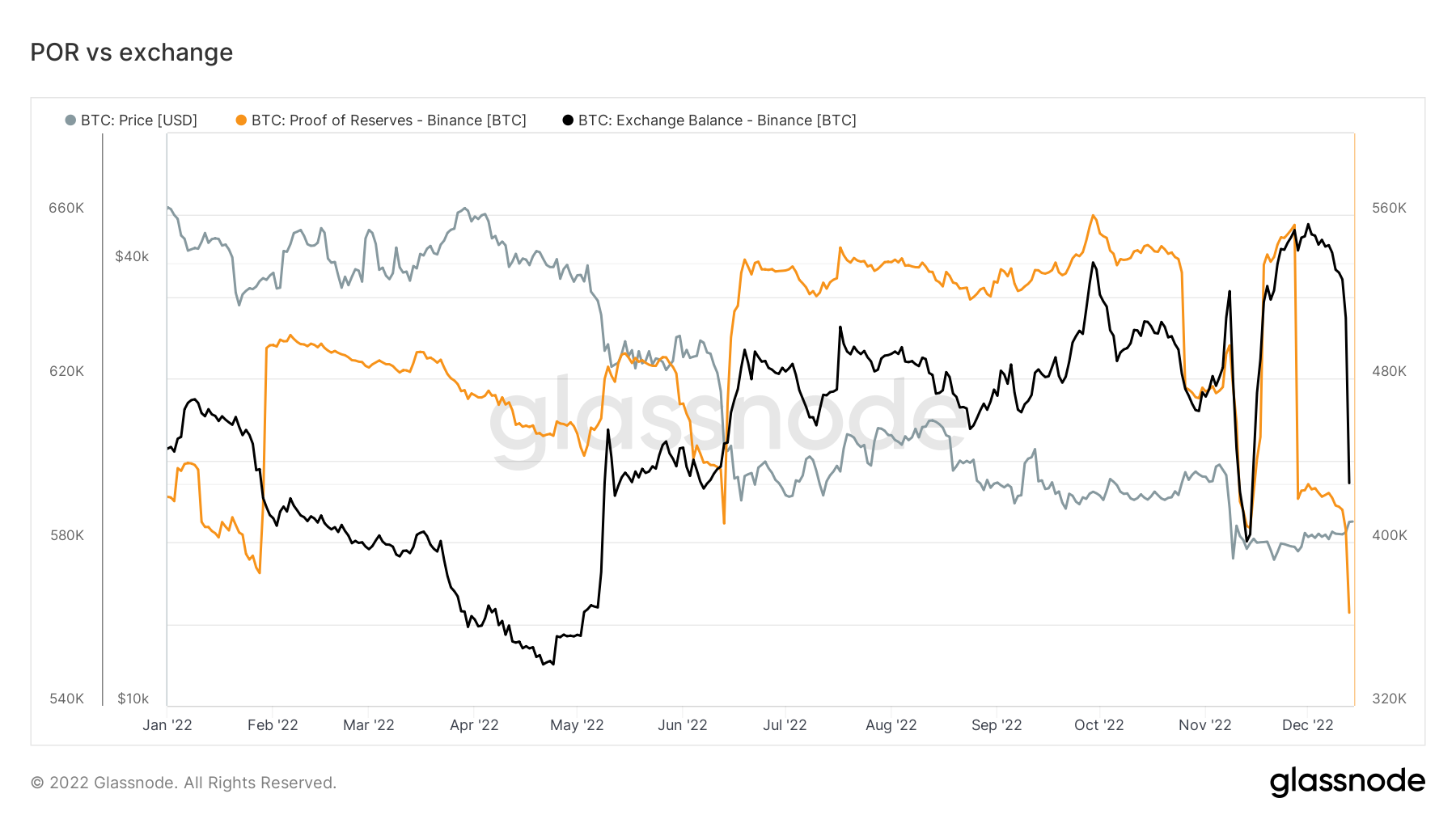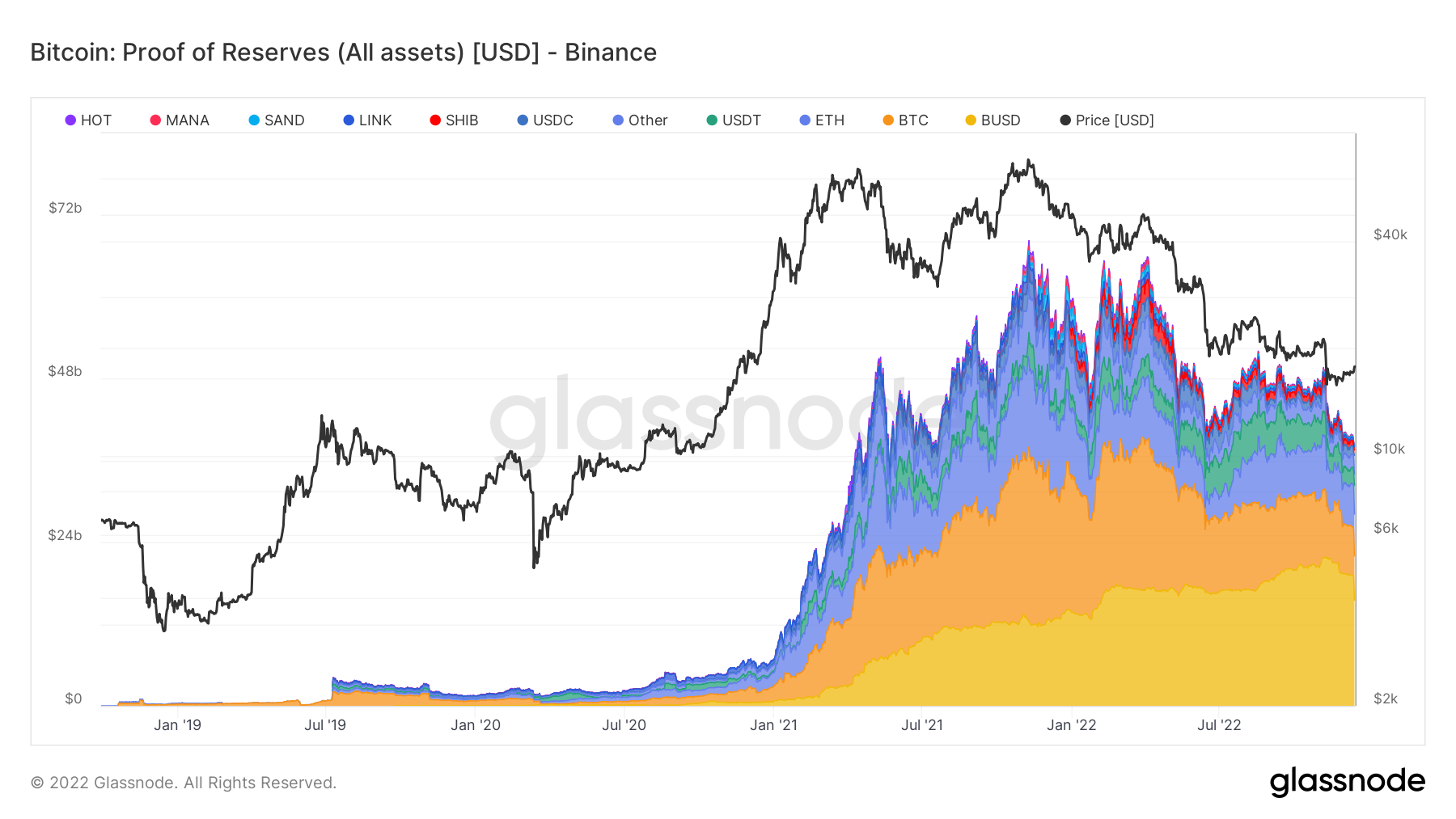 Binance’s PoR total USD currently sits below $40 billion, as can be observed below in the Glassnode chart below. This reveals a steep decline since the start of the year and a fall in PoR holdings of approximately $13.2 billion since Sept.