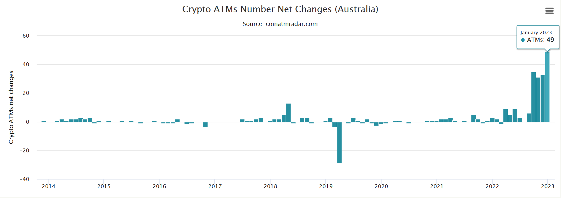 Australia represents 0.6% of global crypto ATM installations and, at this rate, is well-positioned to take over Asia’s crypto ATM numbers, which stand at 312 ATMs. The total number of crypto ATMs worldwide is 38,602, out of which 6,071 ATMs were installed in 2022 alone.