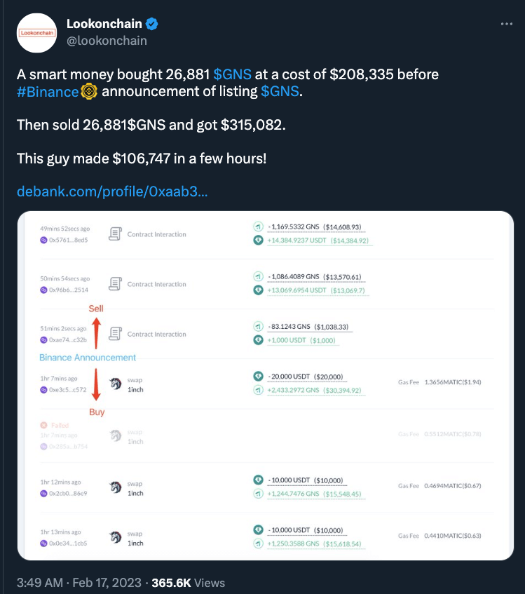 On Feb. 17, a wallet that had been previously engaged in front-running token listings on Binance made another trade, this time purchasing and selling the Gains (GNS) token just before listing on the world’s leading exchange.