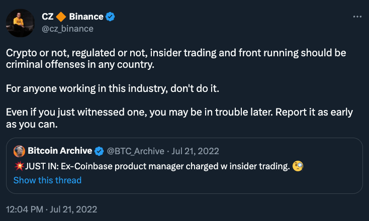 In July, when charges were initially brought against Wahi, Changpeng Zhao (CZ), the CEO of Binance, condemned the actions of the Coinbase employee, stating that “insider trading and front running should be criminal offenses in any country,” whether they involve cryptocurrencies or not.