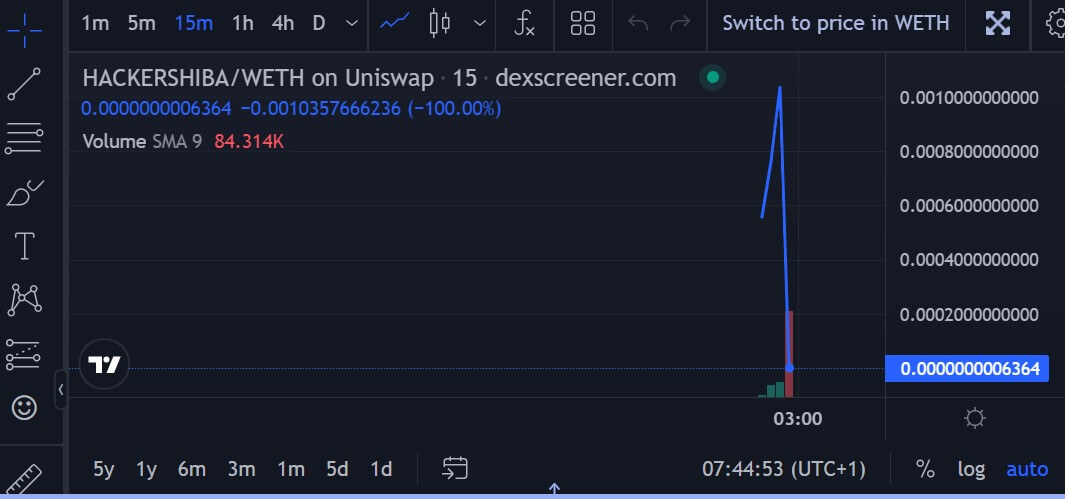 Dexscreener data showed that the grifter profited over 50 WETH from the scam tokens. HACKERSHIBA had a trading volume of $108,000.