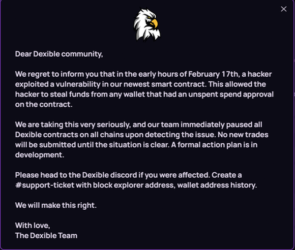 As of 6:35 p.m. UTC on Feb. 17, the DexibleApp frontend shows a popup warning about the hack whenever users navigate to it.