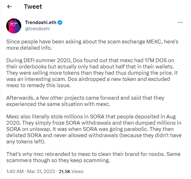 This is not the first time MEXC has faced controversy. In the past months, the exchange was accused of scamming users. Trendoshi.eth detailed MEXC’s alleged misdeeds in a tweet, revealing that during DEFI summer 2020, Dos discovered MEXC had only half the 17M DOS tokens they claimed in their wallets. By selling more tokens than they possessed, MEXC was able to artificially deflate prices, executing an elaborate scam.