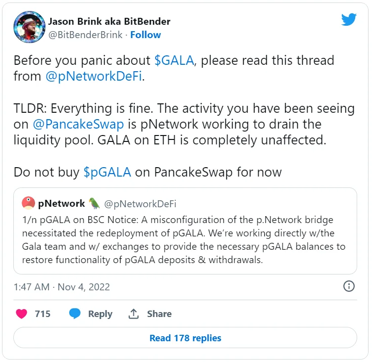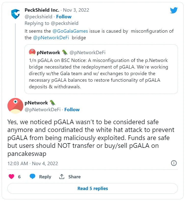 Представители pNetwork сообщили, что причиной инцидента стала «неверная конфигурация» кроссчейн-протокола. Они добавили, что работают с командой Gala и биржами для обеспечения необходимого баланса pGALA и восстановления возможности депонирования и снятия средств.