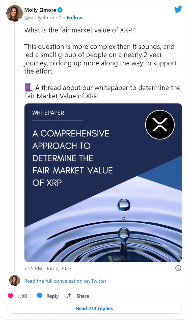 Что еще говорится в исследовании? Элмор поделилась в своем Twitter документом под названием «Комплексный подход к определению справедливой рыночной стоимости XRP», который был подготовлен обширным «конфиденциальным комитетом». В него включены такие переменные, как глобальный объем транзакций, их ежедневная стоимость, а также оборотное предложение XRP.
