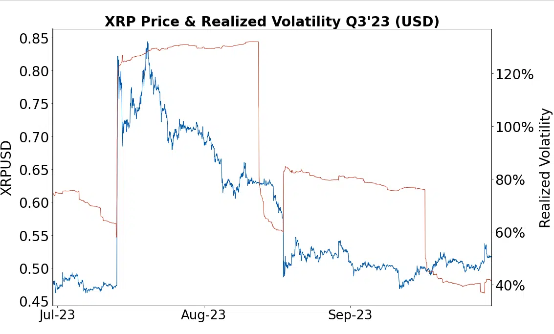 В отчете также подчеркнута цена XRP и реализованная волатильность, отметив, что волатильность значительно выросла в две важные даты: 13 июля и 17 августа.