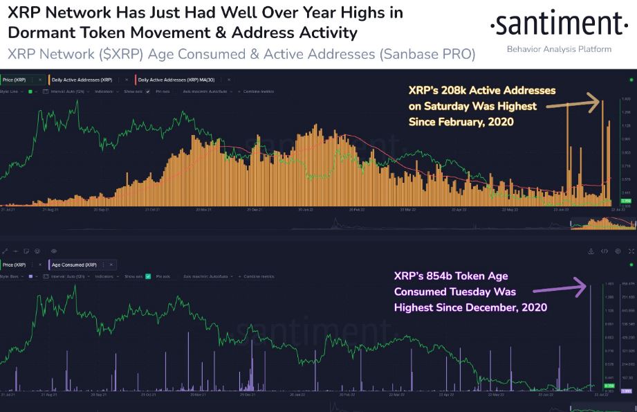 Santiment выделяет больше деталей на своей диаграмме; По словам аналитика данных, в сети XRP было значительно больше годового максимума по перемещению бездействующих токенов и активности адресов, поскольку 208 тыс. адресов XRP в субботу были самыми высокими с февраля 2020 года. Возраст токенов XRP, потребляемых во вторник, был самым высоким с декабря 2020 года.