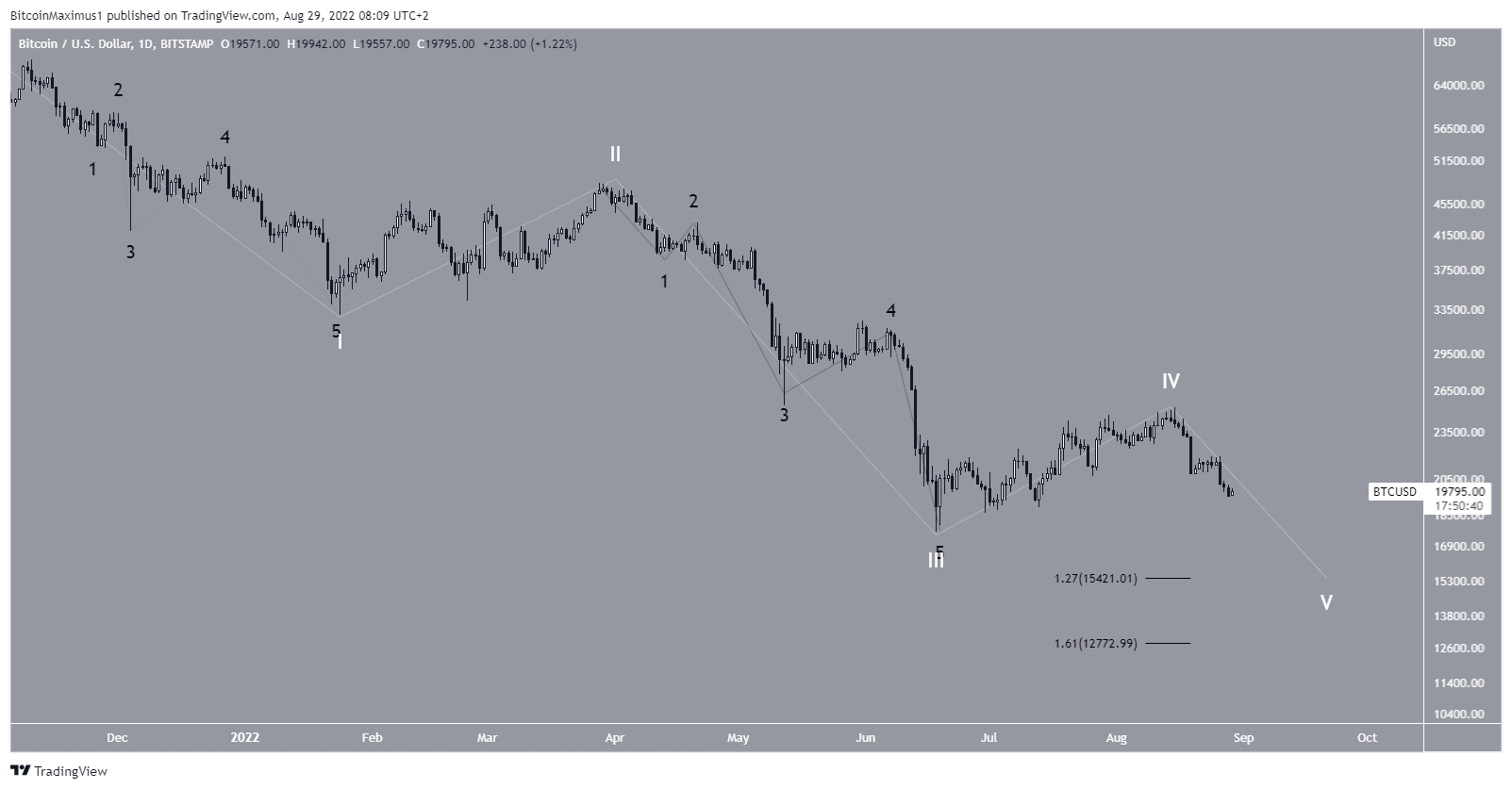 Наиболее вероятный сценарий долгосрочного волнового анализа теперь предполагает медвежью альтернативу. Согласно его результатам, BTC начал волну 5 (белый цвет) медвежьей структуры, берущей свое начало от исторического максимума. Сейчас коин находится в пятой, заключительной, волне этой структуры.