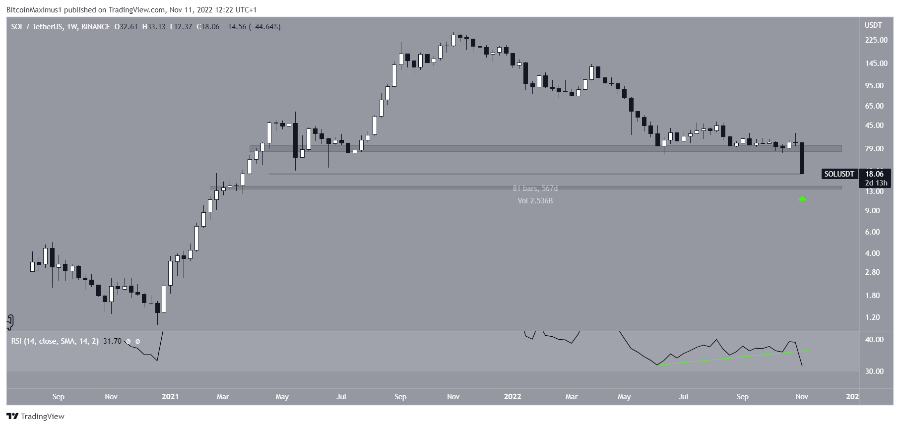 В более долгосрочной перспективе можно увидеть, что курс SOL достиг исторического максимума в ноябре 2021 года и с тех пор снижался. Сначала цена отскочила от области горизонтальной поддержки $29, но 9 ноября все-таки совершила ее медвежий пробой. В итоге минимум был отмечен на $12.37.