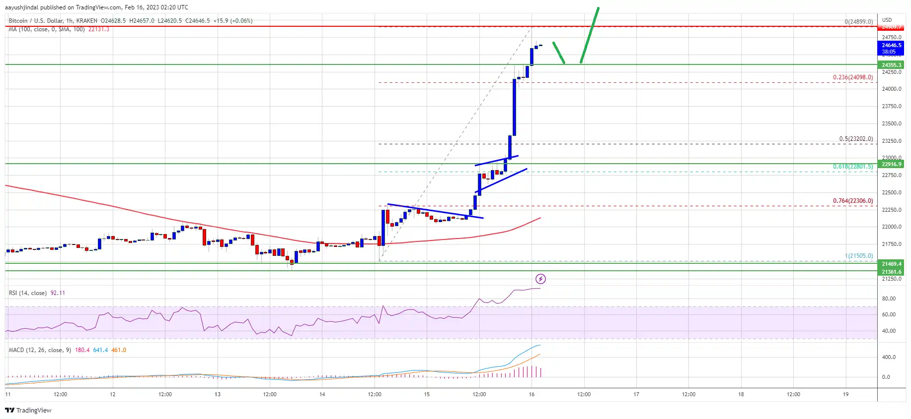 Во время роста произошел прорыв пары паттернов в районе отметки $22 900 на часовом графике пары BTC/USD. BTC даже преодолел зону сопротивления в $24 000 и закрепился намного выше 100-часовой простой скользящей средней.