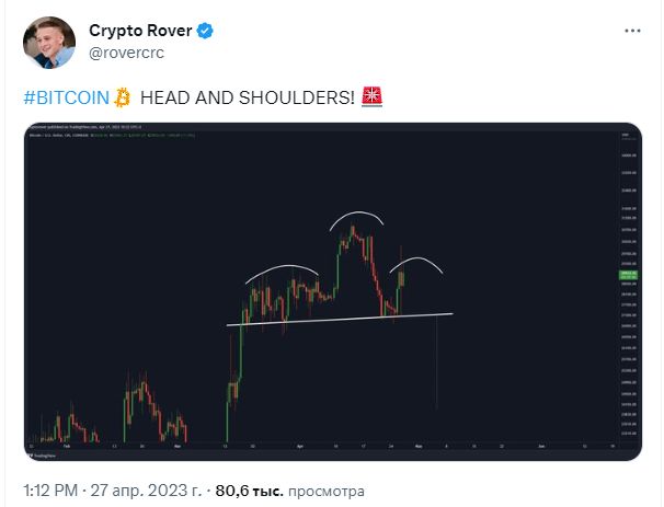 Через несколько часов криптотрейдер Crypto Rover написал, что на 12-часовом графике BTC сформировался медвежий паттерн «голова и плечи». Если он подтвердится, в ближайшие 24-48 часов цена биткоина упадёт.