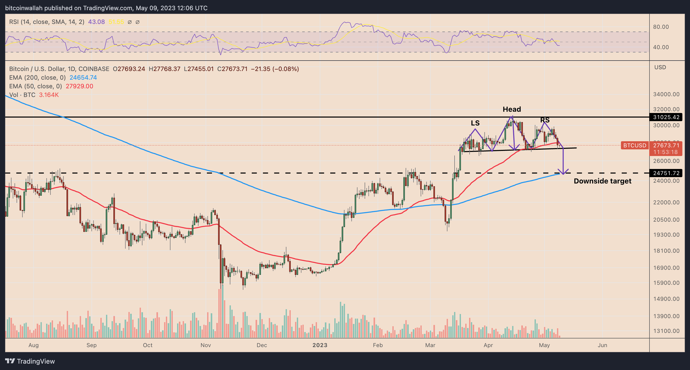 Цена BTC упала ниже $27 500 9 мая, что на 8% ниже локального максимума в $29 850, установленного три дня назад. Более того, падение сопровождалось ростом объемов торгов, что говорит о том, что движение имеет импульс.