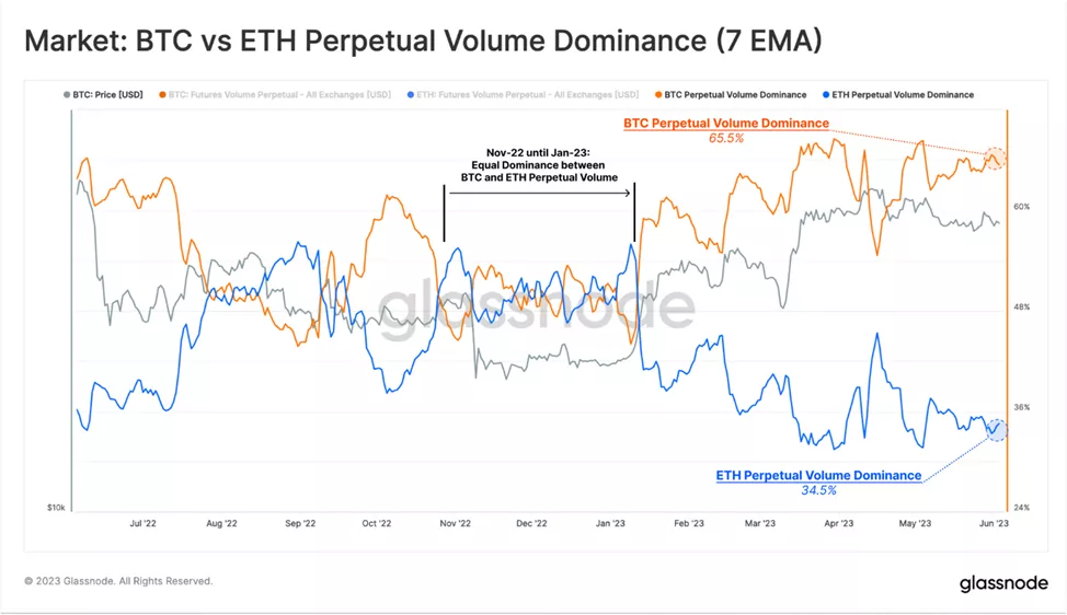 В подтверждение тезиса аналитики привели соотношение объема торгов на рынке бессрочных контрактов биткоина и Ethereum. После паритета в конце 2022 года, доля последнего стала снижаться и в настоящее время опустилась до 34,5%, что говорит о предпочтениях в пользу более «защитной» первой криптовалюты, подчеркнули специалисты.