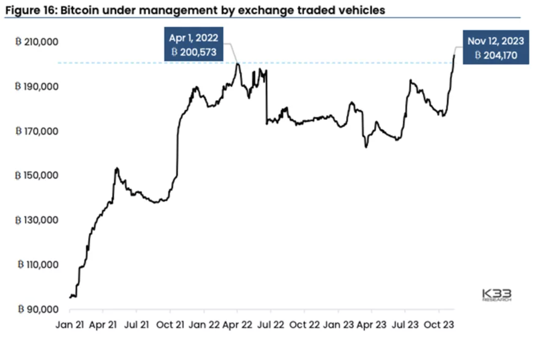 Объем активов в регулируемых инвестиционных инструментах на базе биткоина (BTC) достиг рекордного показателя 204 170 BTC (более $7,5 млрд), сообщили аналитики компании K33 Research в новом еженедельном отчете.