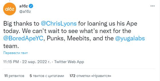 “Большое спасибо @ChrisLyons за то, что одолжил нам сегодня своего Ape. Нам не терпится увидеть, что будет дальше с @BoredApeYC, Punks, Meebits и командой @yugalabs.”, — писал a16z 22 марта 2022 г.
