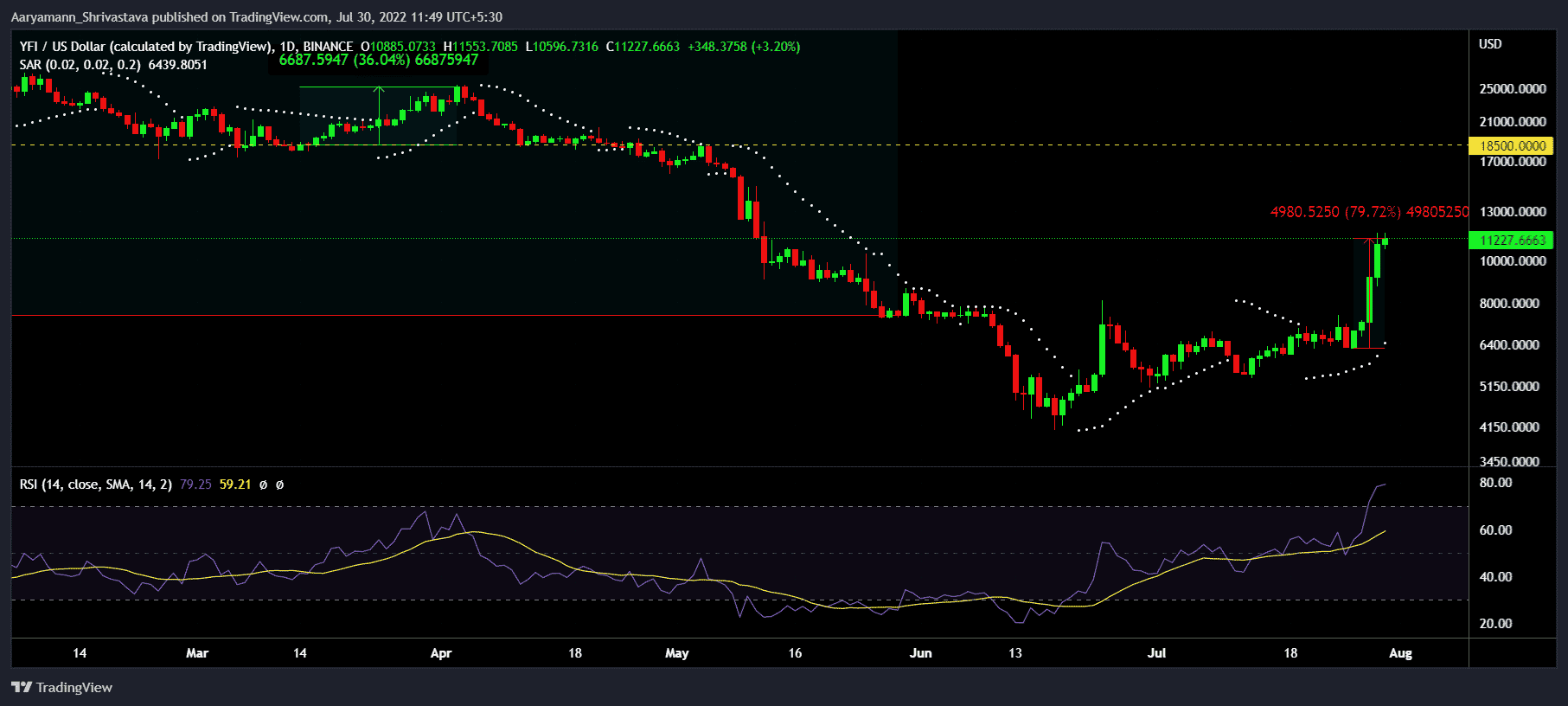 Индекс относительной силы (RSI) показывает то же самое, и это может вызывать беспокойство у держателей YFI, поскольку они могут довольно быстро потерять свою прибыль.