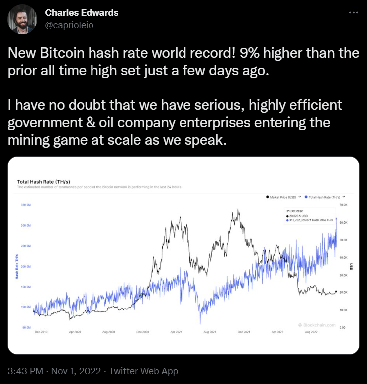 По его словам, рост хешрейта сети может сигнализировать о выходе на рынок майнинга криптовалют крупных энергетических компаний. Он добавил, что рост хешрейта прямо противоречит утверждению о капитуляции майнеров.