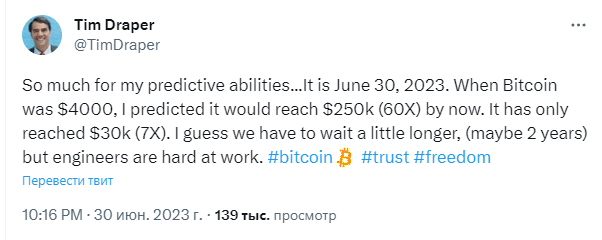 Ранее Дрейпер ранее предсказывал, что цена биткоина достигнет 250 тысяч долларов к концу 2022 года.