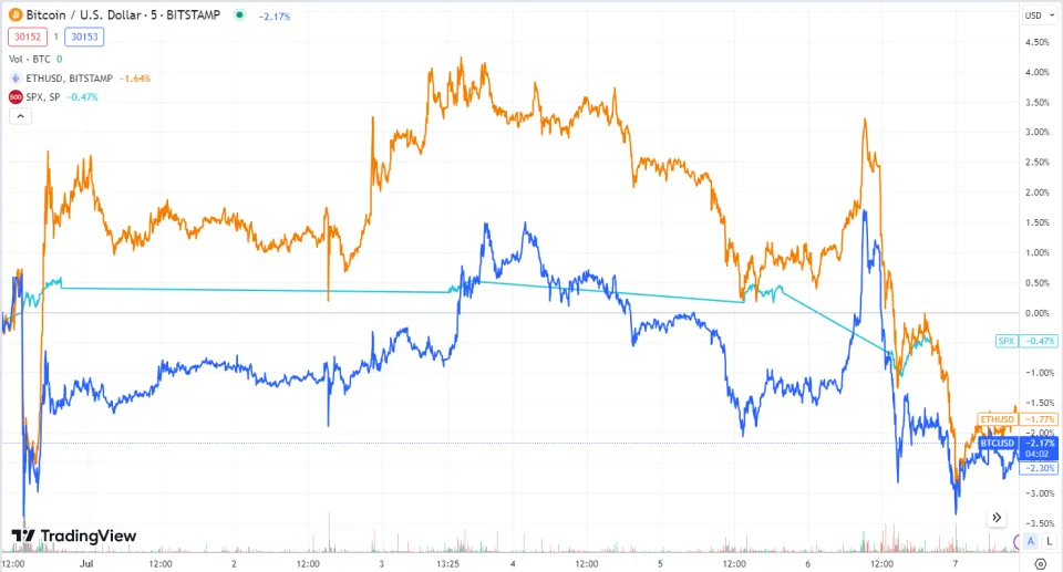 Это произошло после того, как сильные данные по занятости ADP показали создание 497 000 новых рабочих мест в июне. В целом, пока макроэкономические перспективы для Биткоина остаются сложными. Доходность казначейских обязательств повышается. Волатильность возвращается на криптовалютные и фондовые рынки. Инструмент CME FedWatch указывает почти на 90% вероятность повышения ставки на 25 базисных пунктов во время июльского заседания FOMC.