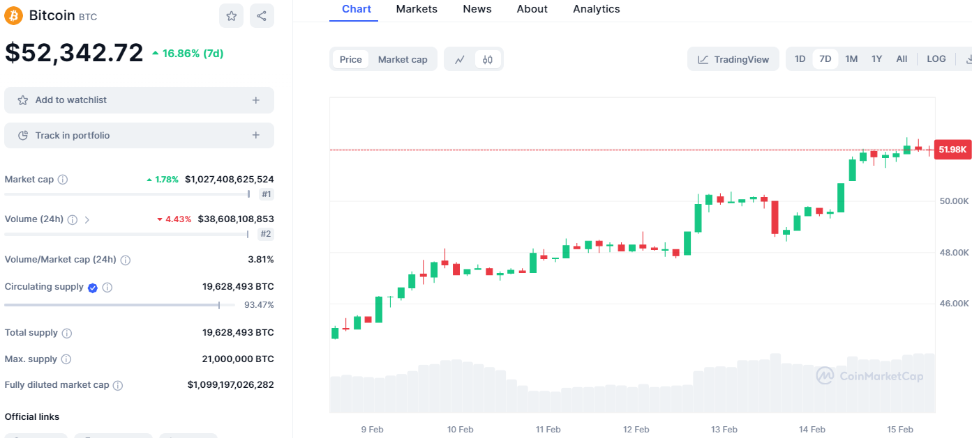 Биткоин вырос на 1,8% за 24 часа до 10:45 UTC 15 февраля и торговался на уровне $52 354. 14 февраля Биткоин достиг двухлетнего максимума в 51 000 долларов, подняв его рыночную капитализацию выше 1 триллиона долларов впервые с ноября 2021 года. Общая капитализация рынка криптовалют составляет 1,96 триллиона долларов, что на 2,01% больше, чем днем ранее.
