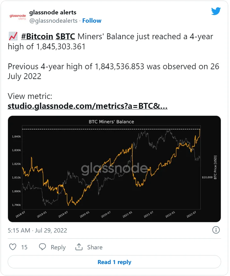 Что произошло? 29 июля общий баланс биткоин-майнеров достиг 4-летнего максимума в 1 845 303 BTC (44,1 млрд долларов по актуальному курсу на 12:10 мск — $23 899), что составляет 9,6% от текущей эмиссии первой криптовалюты. Согласно данным аналитической компании Glassnode, предыдущий рекорд был зафиксирован 26 июля 2022 года — 1 843 536 BTC.