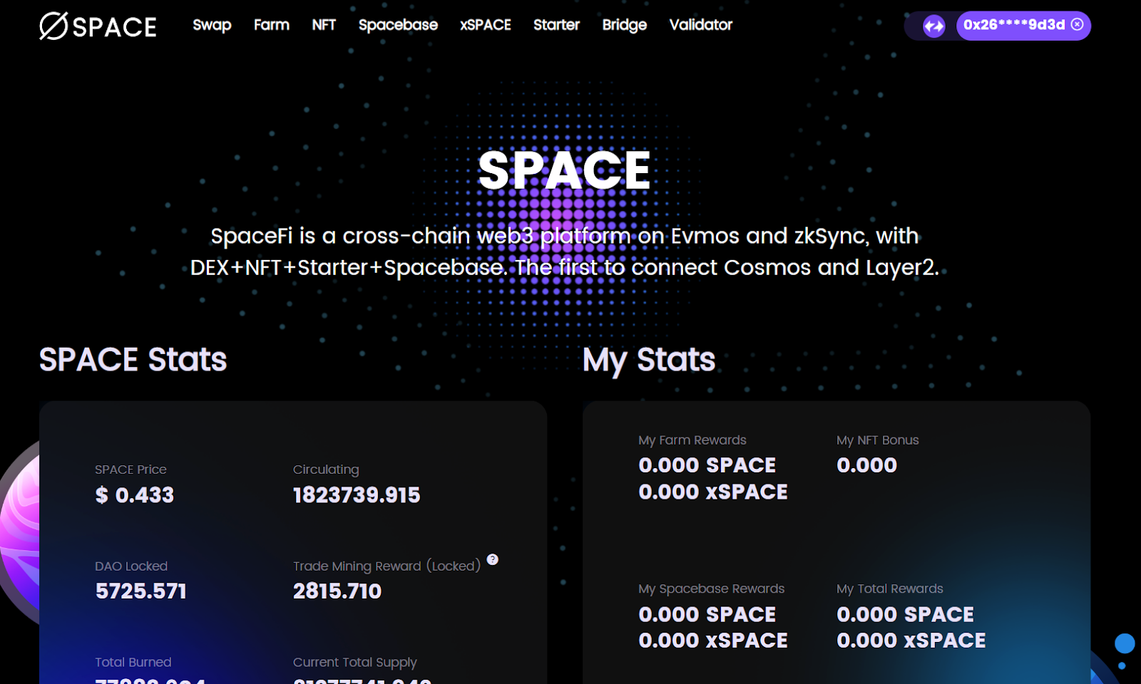 SpaceFi работает в сетях zkSync и Evmos и обеспечивает совместимость блокчейнов, соединяя обе сети. SpaceFi предлагает ряд услуг для энтузиастов криптовалюты и NFT, включая собственные NFT , которые предлагают своим держателям вознаграждения и дивиденды. Между тем, его возможности DeFi включают децентрализованную биржу на базе AMM со стимулирующими пулами ликвидности и пулом с одним активом.