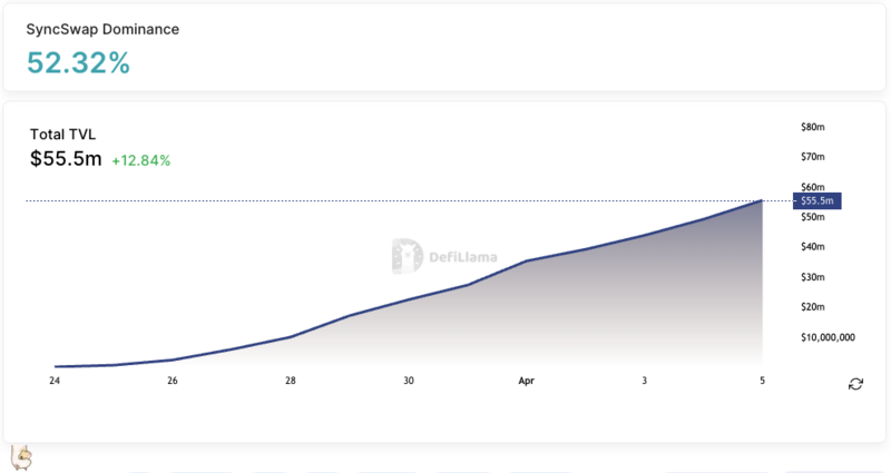 На DefiLlama на момент написания SyncSwap является доминирующим протоколом в zkSync, составляя более 50% TVL сети.